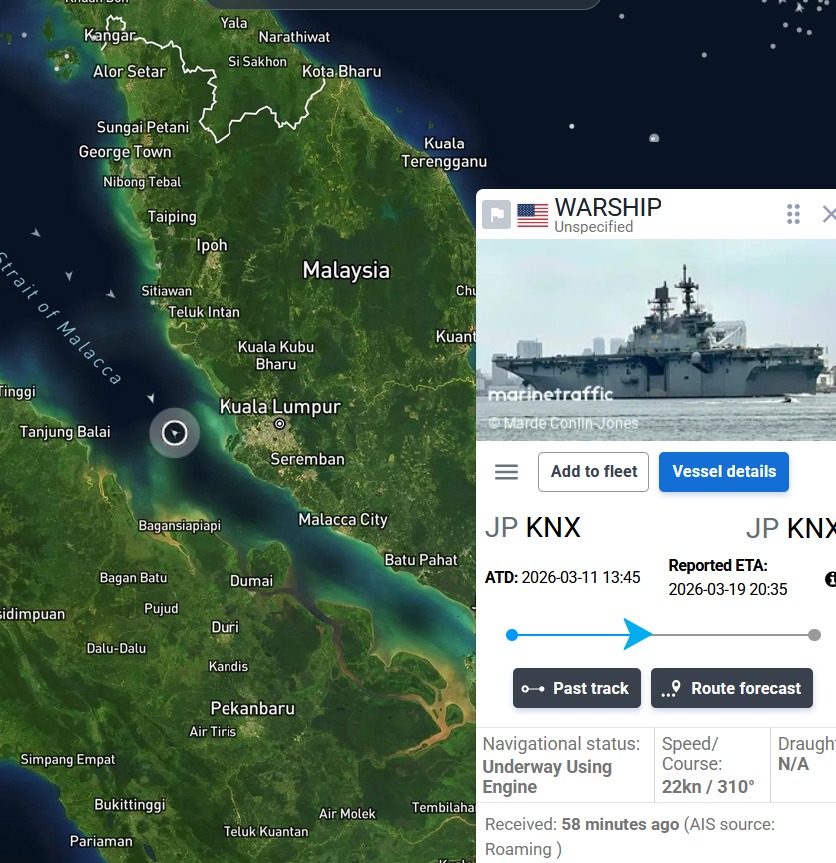 According to maritime tracking data and multiple news outlets, the 45,000-ton, 850-foot vessel — essentially a small aircraft carrier capable of embarking F-35B stealth fighters, MV-22 Osprey tilt-rotors, attack helicopters, and landing craft — was observed approaching the southwestern edge of the South China Sea and entering the busy Singapore Strait on March 17. Automatic Identification System (AIS) signals briefly tracked an “unspecified U.S. warship” departing the Okinawa area on March 11 and cruising at around 22 knots through the South China Sea before nearing Singapore.